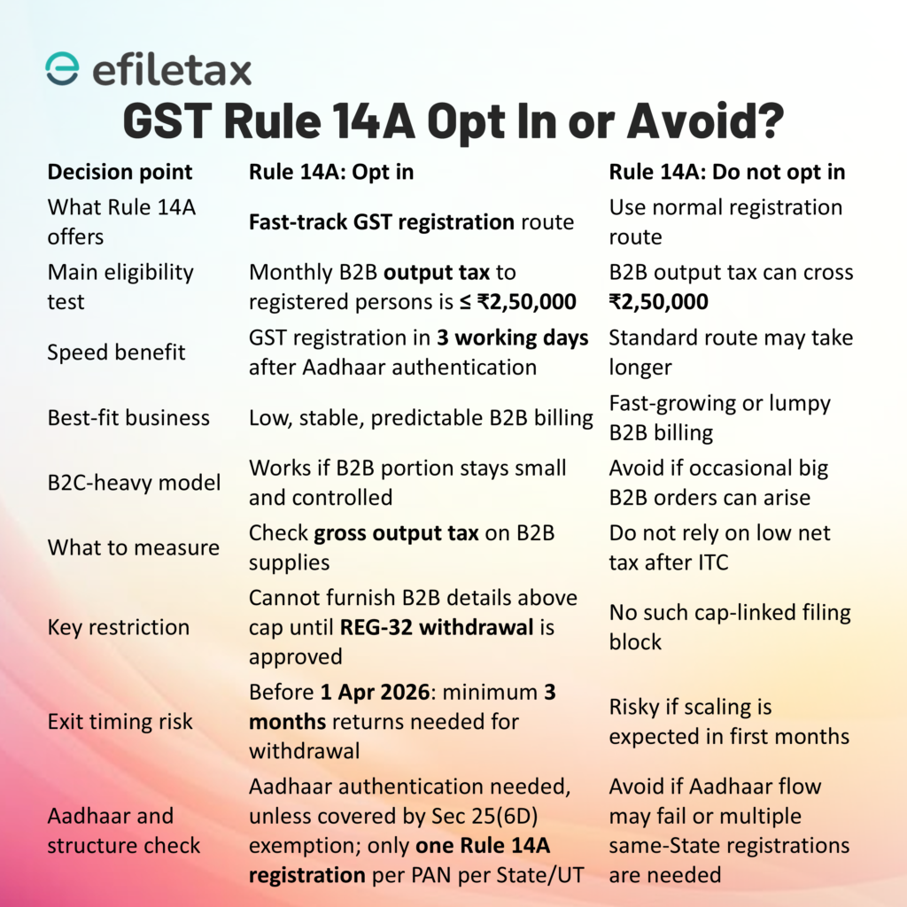 However, the faster approval comes with an important operational restriction — a monthly cap of ₹2.5 lakh on B2B output tax liability. Because of this limit, choosing Rule 14A should be a carefully considered business decision rather than simply a quicker administrative process.